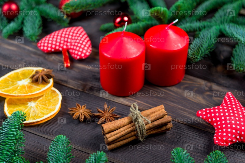 Свечи, специи и еловые ветки Рождественские предметы на деревянном столе, крупным планом