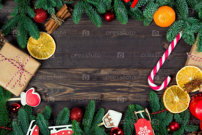 Деревянные доски с объектами новогоднего крупным планом, в центре находится пространство для вашей надписи
