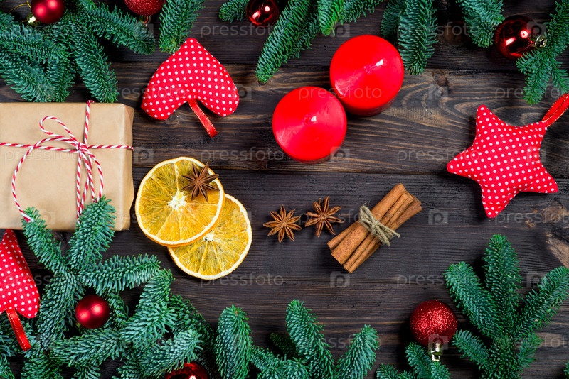 Набор объектов Top View Новогодняя открытка.Сушеные оранжевые, коричневые, красные свечи и звезды ручной работы на деревянном фоне