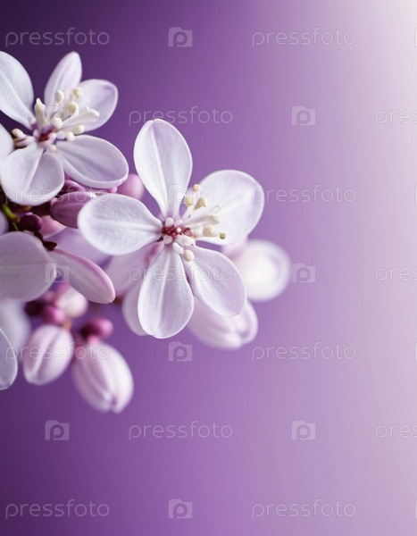 Выстрел нежных цветов сирени, лепестков мягкого, пастельного фиолетового и белого, на размытом фоне. Изображение фиксирует сложные детали цветов, демонстрируя их нежную красоту. ИИ