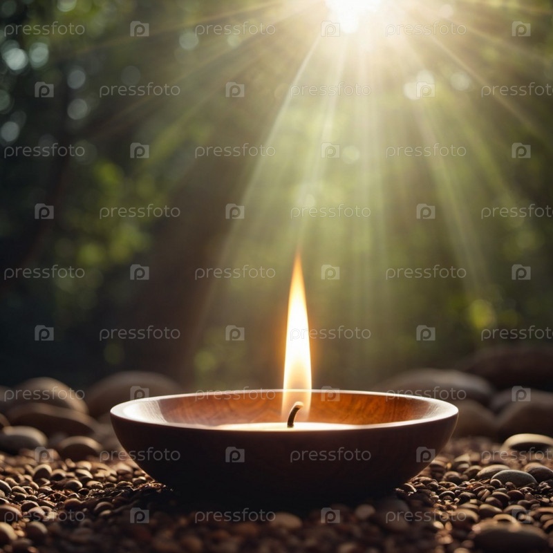 Свеча горит в блюде с плеском дыма, поднимающегося из пламени. Фон мягкий, размытый зеленый, что предполагает естественную наружную обстановку. Теплое свечение и спокойная сцена создают ощущение спокойствия