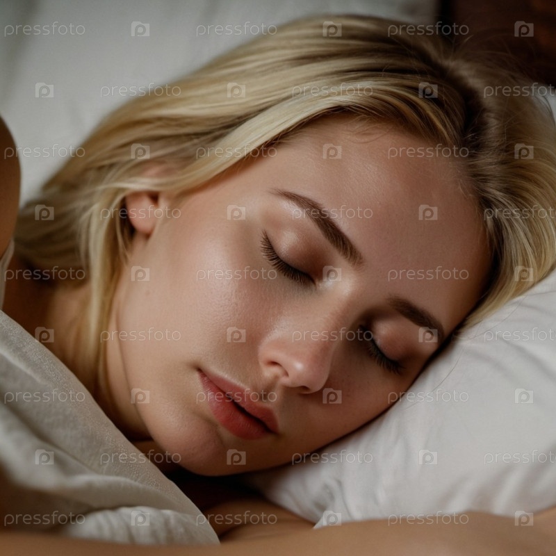 Мирная блондинка крепко спит в уютной постели, окруженная мягкими подушками и безмятежной ночной атмосферой. Генеративный ИИ. Молодая блондинка спокойно спит в постели, наслаждаясь спокойным моментом
