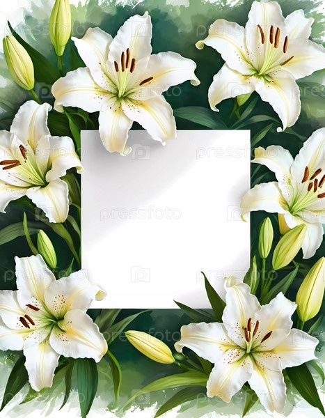 Очаровательные белые лилии с зелеными листьями создают тонкую границу вокруг пустого пространства, идеально подходящую для добавления персонализированных сообщений или дизайнов. Генеративное искусство. Копируйте место, поздравительная открытка