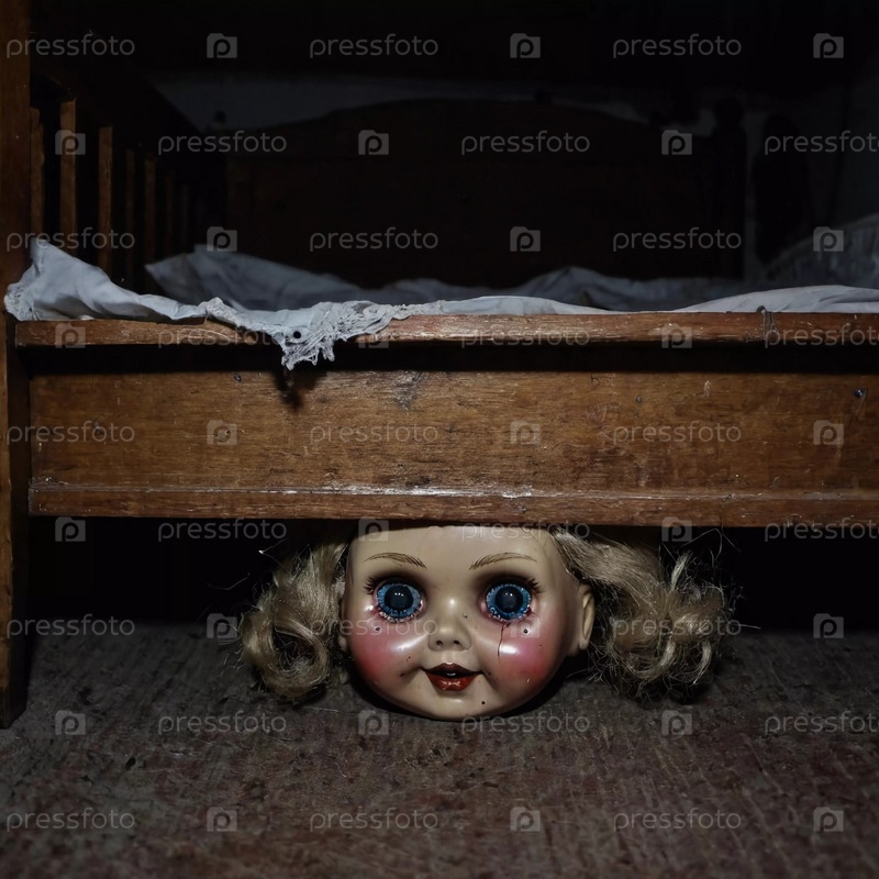 Тревожная старая кукла с преследующими глазами и винтажной одеждой выскочила из-под ретро-кровать, вызывая жуткое чувство в тускло освещенном пространстве. Страшная кукла для ужасов и Хэллоуина. Генеративный ИИ