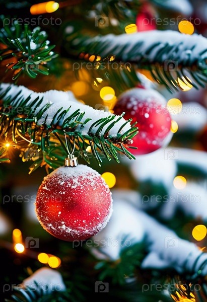 Красочные рождественские украшения украшают ветви елки, яркие шары в оттенках красного и розового, олицетворяющие праздничное настроение зимой. С Новым годом искусство боке фон. Генеративный ИИ