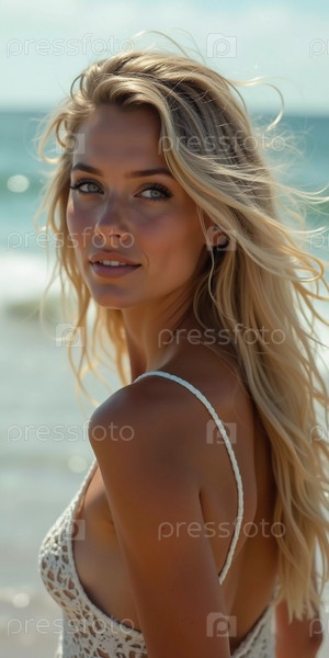Блондинка в купальнике смотрит назад, стоя у береговой линии. Нежные морские волны лазают у ее ног под ясным голубым небом. Длинные волосы, красивое молодое лицо. Реклама путешествий и одежды. ИИ