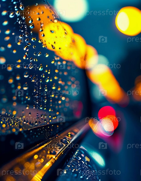Капли дождя цепляются за поверхность автомобильного стекла, искажая яркий городской пейзаж вечером, где красочные огни от движения и зданий сливаются в красивый дисплей. Генерирующий ИИ