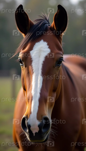 Коричневая лошадь изящно стоит на открытом поле, ее выразительные глаза отражают мягкий свет, создавая спокойную атмосферу в пейзаже