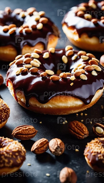 Заманчивый показ шоколадных глазурованных пончиков, увенчанных различными орехами, демонстрируется на деревенском деревянном столе. Теплое освещение усиливает вкусные детали и текстуры угощений. Генерирующий ИИ