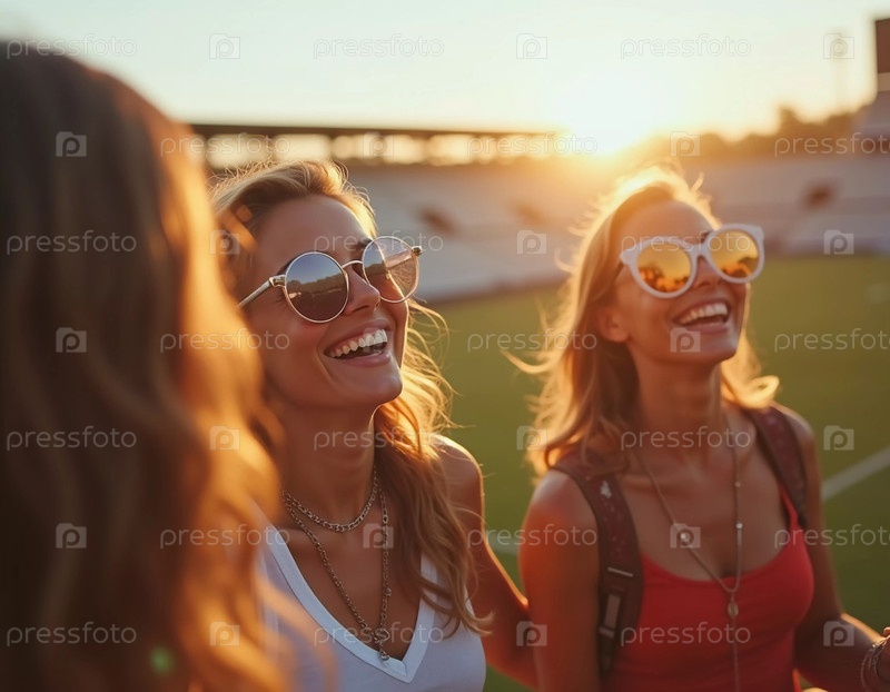 Трое друзей греются в сиянии заката, разделяя смех и радость на оживленном стадионе. Их красочные наряды и веселые выражения подчеркивают незабываемый день вместе