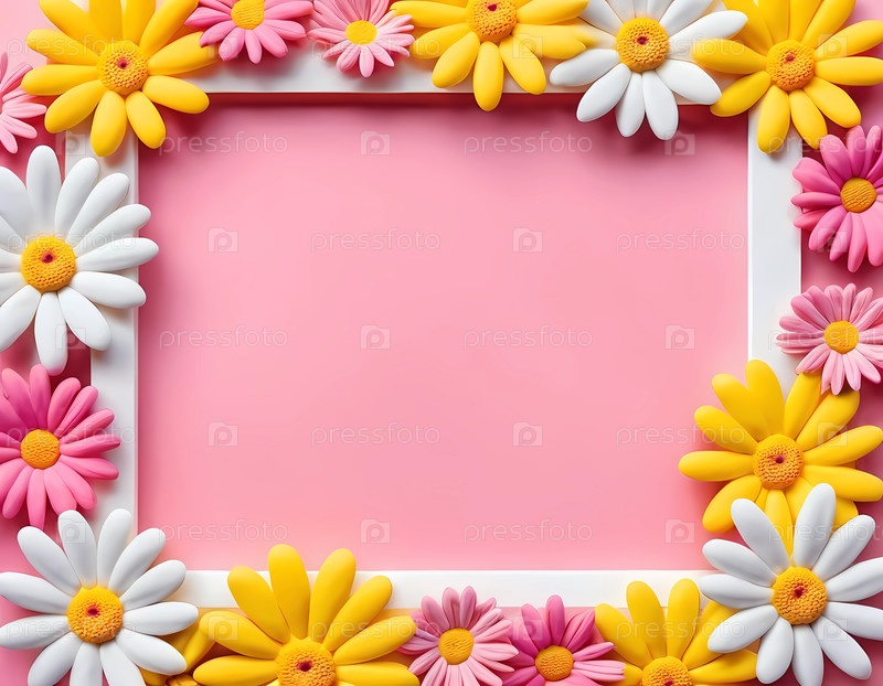 Веселые ромашки в белом, желтом и розовом цвете на пустом пастельном фоне, создавая яркую рамку, которая внушает радость и творчество в художественном выражении
