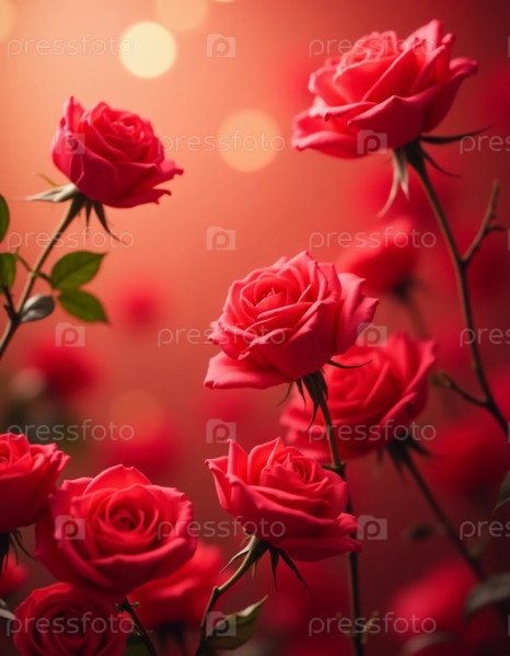 Пышные красные розы цветут страстно, бархатистые лепестки ловят нежный проблеск боке. Очаровательная аранжировка, завораживающая атмосферой, вызывает восхищение. Чистое пространство приглашает сердечные сообщения