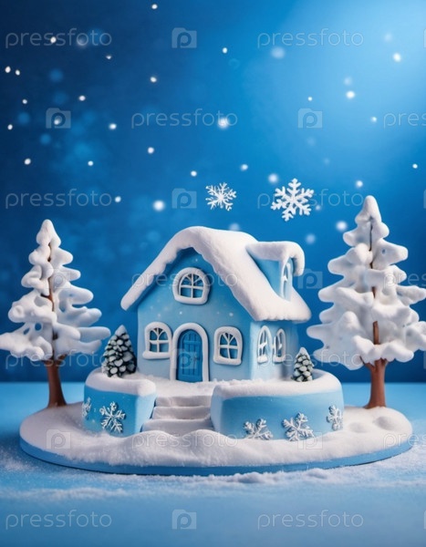 Причудливая деревня, пряничный домик, заснеженные крыши, окна и дымоход. Дом окружен снегом и снежинками. Синий фон боке. Праздничная и очаровательная зимняя страна чудес. ИИ генерирует