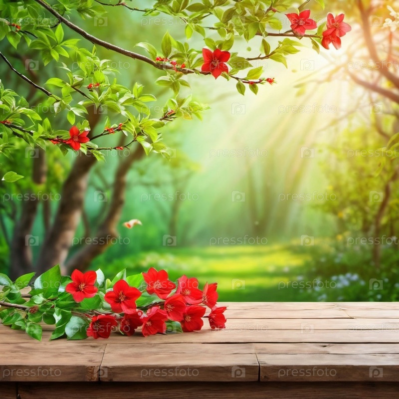 Деревянный стол сидит перед размытым фоном весеннего сада. Красные большие цветы на ветке достигают солнца, которое светит сквозь листву. Копирование пространства для демонстрации продукции. ИИ