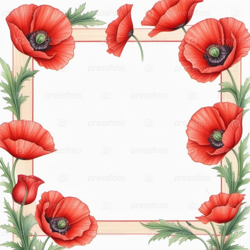 Красные маки, зеленые листья, стебли. Щенки изображены на различных стадиях цветения, причем некоторые полностью открыты, а другие в зародыше. Мягкая спина, создающая нежные романтические чувства. Копируйте пространство. Открытка или макет