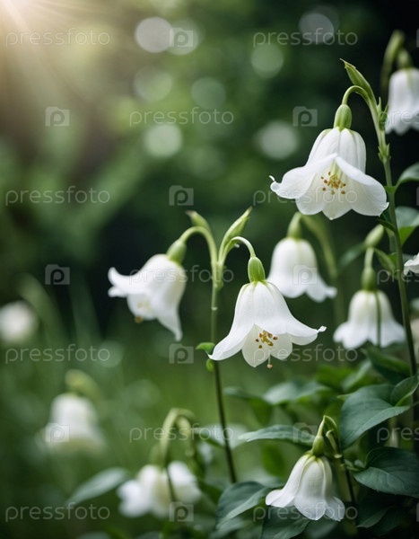Белые синие колокольчики цветут в пышном зеленом лесу. Яркий контраст против богатой листвы. Красивая природная сцена. Вне фокуса фон. Глубина и спокойствие. Сгенерированный ИИ. Копируйте пространство для текста