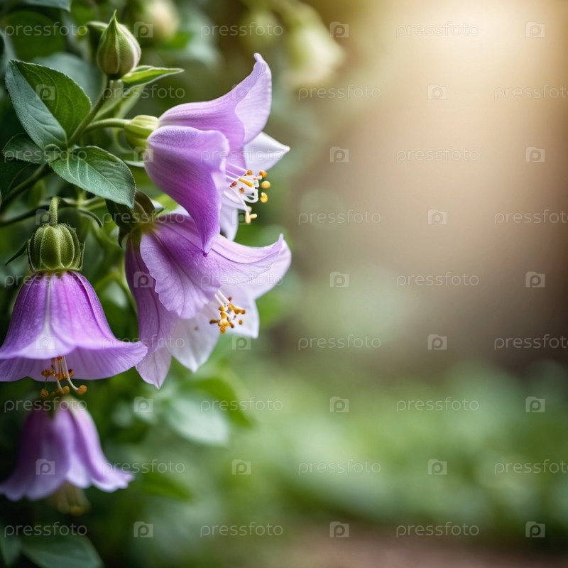 Фиолетовые розовые цветы блюбелла цветут в пышном лесу. Лепестки цветов создают яркий контраст против богатой листвы. Красивая природная сцена. Вне фокуса фон. Глубина и спокойствие. ИИ