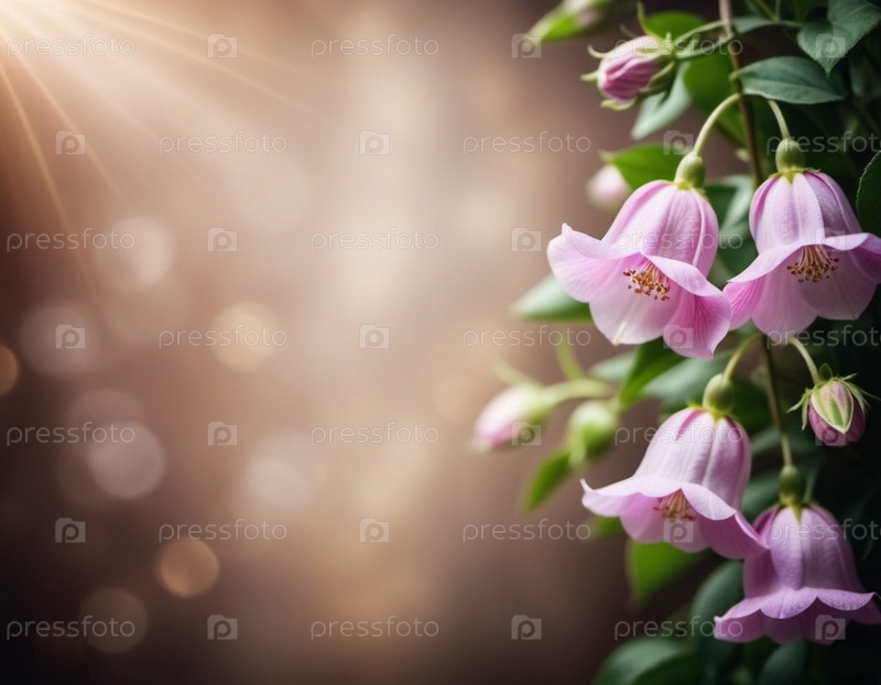 Фиолетовые розовые цветы блюбелла цветут в пышном лесу. Лепестки цветов создают яркий контраст против богатой листвы. Красивая природная сцена. Вне фокуса фон. Глубина и спокойствие. ИИ