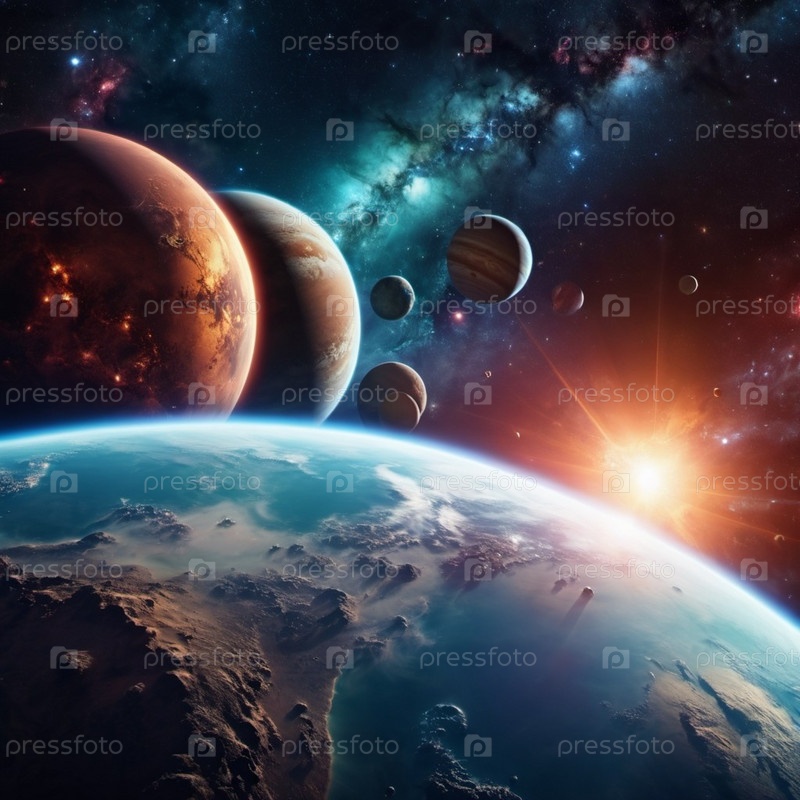 Планетарная система с несколькими планетами, большой ярко окрашенный газовый гигант и скалистая планета. Яркие звезды и обширное пространство темного пространства с галактикой на заднем плане. Космические пространства. Космонавтика. ИИ