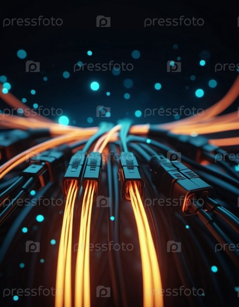 Синие и оранжевые светящиеся провода скручиваются и переплетаются на темном фоне с боке. Черные кабели и разъемы со светящимися огнями и цепями соединяются, чтобы сформировать сеть. генерируемый