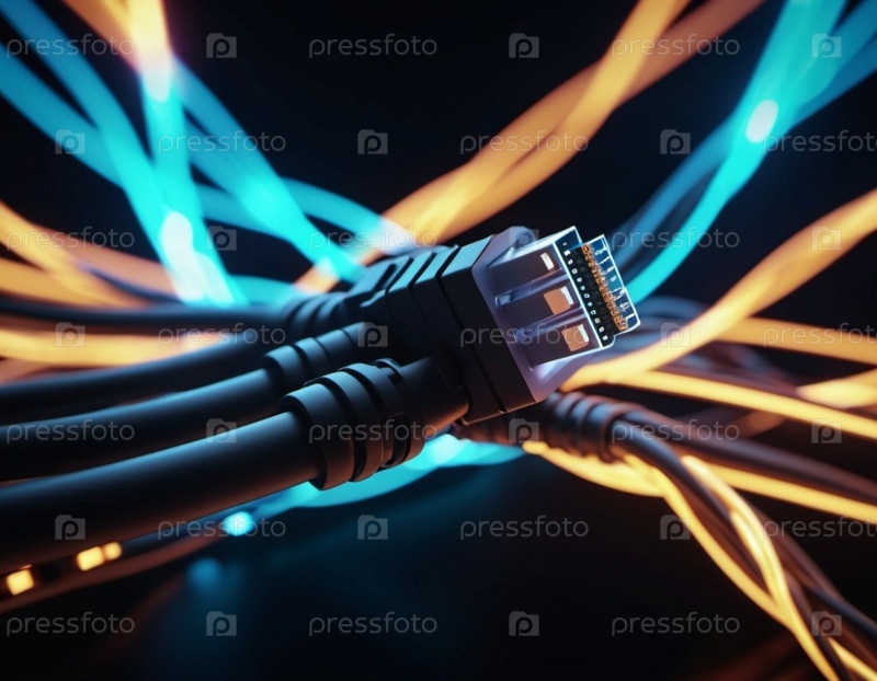 Синие и оранжевые светящиеся провода скручиваются и переплетаются на темном фоне с боке. Черные кабели и разъемы со светящимися огнями и цепями соединяются, чтобы сформировать сеть. генерируемый