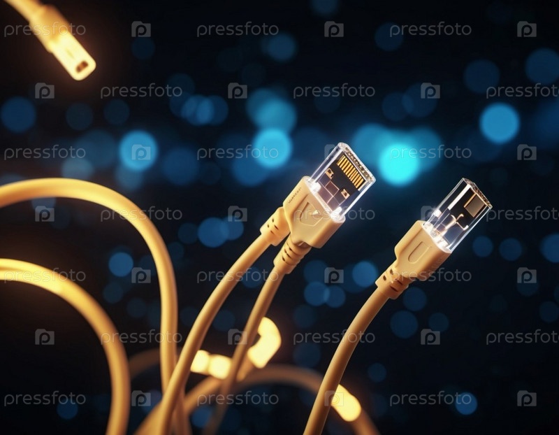 Синие и оранжевые светящиеся провода скручиваются и переплетаются на темном фоне с боке. Черные кабели и разъемы со светящимися огнями и цепями соединяются, чтобы сформировать сеть. генерируемый