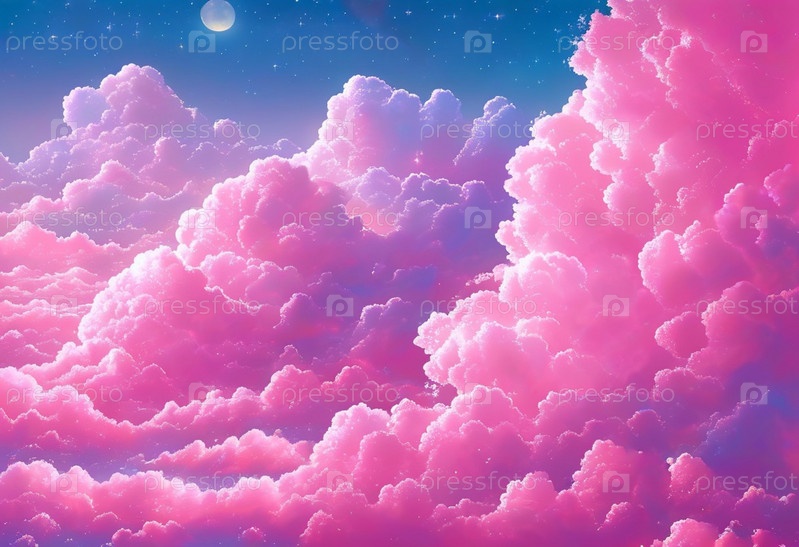 Красивые розовые пушистые облака в ярком закате неба. Визуальный дисплей. Драматические нереальные небеса с кучевыми и стратовыми облаками в атмосфере. Неизвестная планета с розовыми облаками Луна, планеты и звезды. Искусство