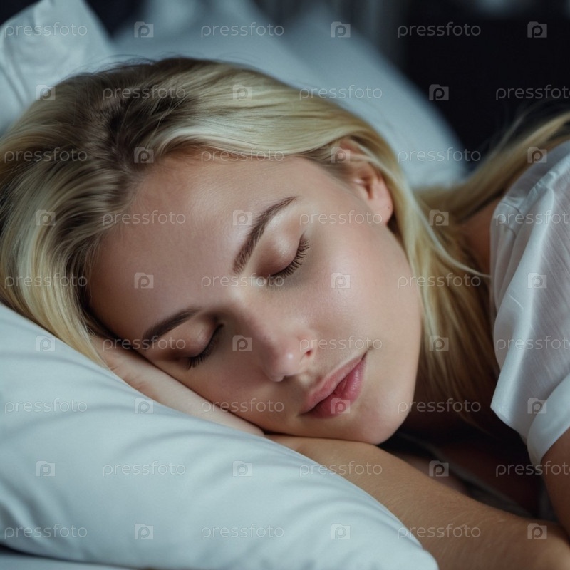 Мирная блондинка крепко спит в уютной постели, окруженная мягкими подушками и безмятежной ночной атмосферой. Генеративный ИИ. Молодая блондинка спокойно спит в постели, наслаждаясь спокойным моментом