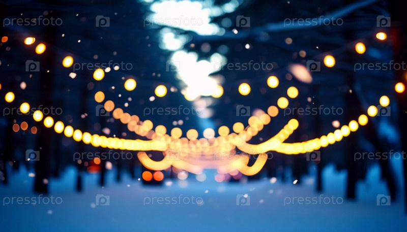 Зима приносит мягкий снегопад на городские улицы, где над головой висят красочные огни, создавая теплую и праздничную атмосферу. Эффект боке от огней добавляет причудливого прикосновения, подчеркивая радость сезона