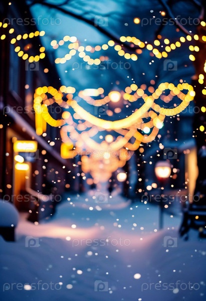 Зима приносит мягкий снегопад на городские улицы, где над головой висят красочные огни, создавая теплую и праздничную атмосферу. Эффект боке от огней добавляет причудливого прикосновения, подчеркивая радость сезона