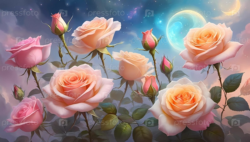 Потрясающая романтическая картина с изящными розовыми и персиковыми розами, цветущими под мягким небесным небом, с сияющим закатом, освещающим сцену. Луна и звезды, вызывающие чувство безмятежности и любви. ИИ
