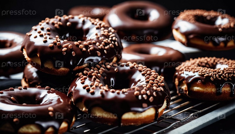 Свежесделанные шоколадные пончики с богатой глазурью и кремовой начинкой сидят на пергаментной бумаге. Они представлены на столе, демонстрируя их восхитительный внешний вид. Какао-коричневая глазурь на булочках. Генерирующий ИИ