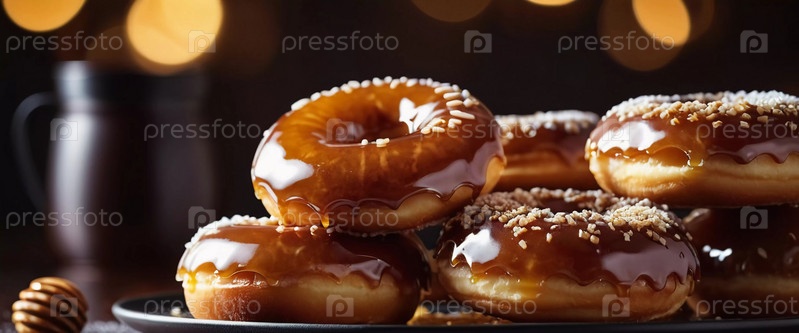 Пачка медовых глазурованных пончиков с глянцевым карамельным покрытием, украшенных хрустящими начинками, приглашая вас побаловать себя сладким угощением. Эти пончики идеально подходят для любого любителя десертов. Генерирующий ИИ