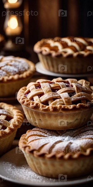 Свежеиспеченные выпечки и пироги привлекательно расположены на столе в теплой пекарне. Их золотые коричневые корки имеют красиво обработанные конструкции, увенчанные пылью сахара. Генерирующий ИИ