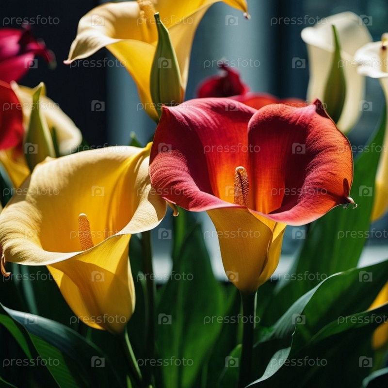 Потрясающий дисплей красных желтых лилий с поразительными центрами, окруженными пышными зелеными листьями, создает элегантную цветочную обстановку, идеально подходящую для любого случая. Генеративный ИИ. Темный фон