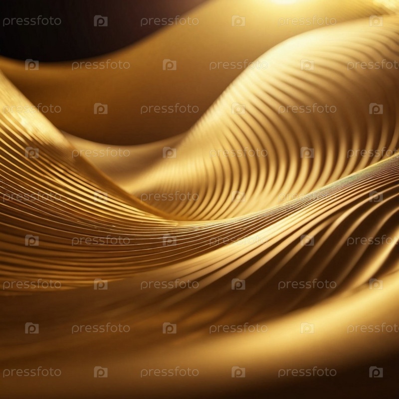 Плавучие 3D-волны в черном и золотом цветах создают увлекательный абстрактный рисунок с гладкими кривыми и световыми градиентами на темном фоне, который вызывает артистизм и спокойствие