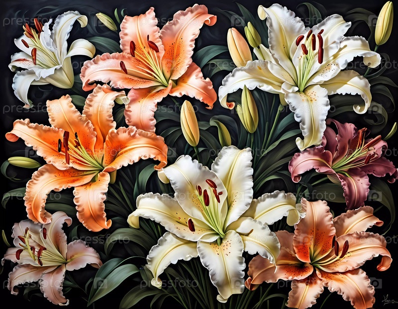 Кластер белых лилий красиво расположен, выделяя замысловатые узоры на лепестках. Темный фон усиливает их элегантность и вибрацию, создавая поразительную композицию. Генеративный ИИ