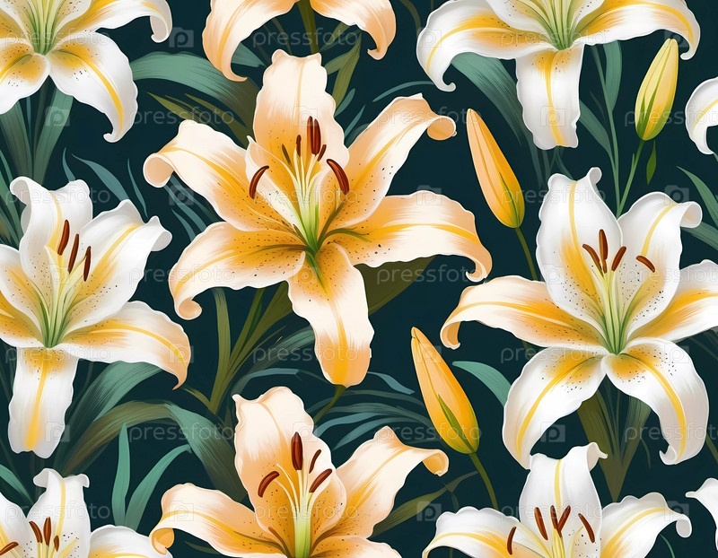 Кластер белых лилий красиво расположен, выделяя замысловатые узоры на лепестках. Темный фон усиливает их элегантность и вибрацию, создавая поразительную композицию. Генеративный ИИ