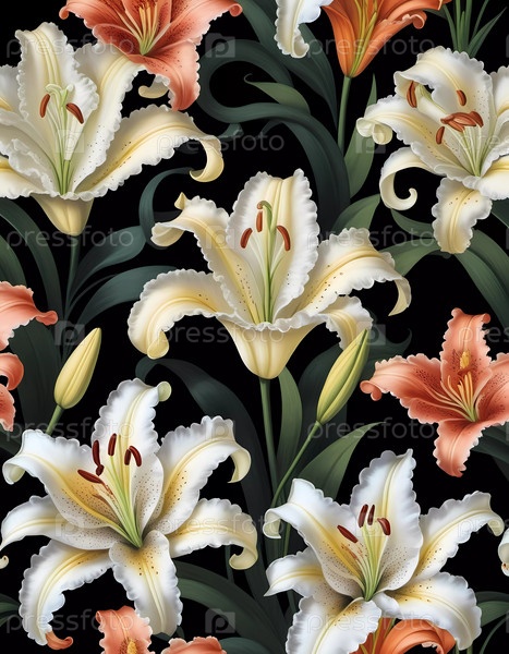 Потрясающий дисплей белых и оранжевых лилий процветает на темном фоне, выделяя сложные цветочные проекты и яркие цвета. Композиция отражает красоту природы. Генерирующий ИИ