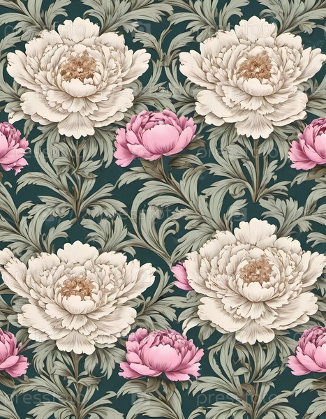 Яркий дизайн демонстрирует негабаритные розовые пионы, красиво расположенные на богатом военно-морском фоне, дополненные подробной зеленой листвой для потрясающего визуального эффекта. Художественный цветочный узор. Генерирующий ИИ
