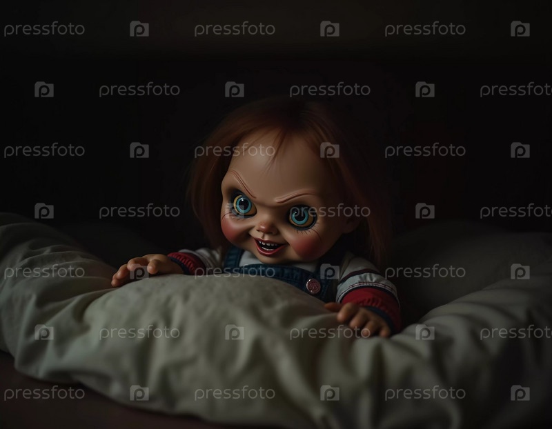 Кукла с преследующими чертами скрывается под кроватью, ее пронзительный взгляд и искривленная улыбка создают леденящую атмосферу в тускло освещенной комнате. Страшная кукла для ужасов и Хэллоуина. Генерирующий ИИ