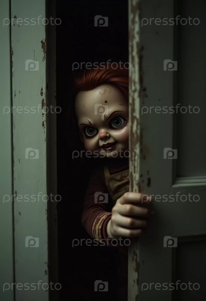 Кукла с пугающими чертами лица выглядывает из шкафа ночью, ее пронзительный взгляд и кривая улыбка создают леденящую атмосферу в тускло освещенной комнате. Страшная кукла для ужаса. Генерирующий ИИ