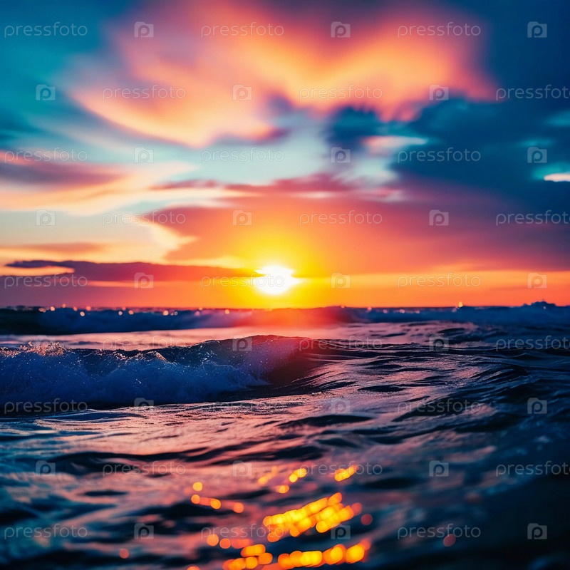 Солнце поднимается над океаном, отбрасывая теплые оттенки через воду. Волны мягко катятся, создавая пузырьки, которые сверкают в раннем свете, в то время как облака пронизывают небо яркими цветами. Генерирующий ИИ