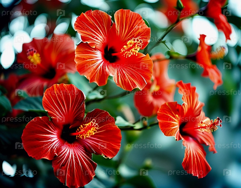 Ярко-красные цветы гибискуса демонстрируют сложные листья в цветущем саду. Прекрасная зелень создает яркий фон для их красоты. Гибискус является крупным родом растений из семейства Malvaceae
