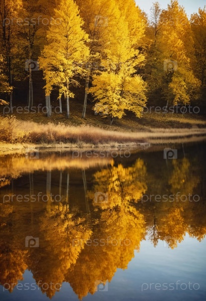 Яркие желтые листья создают потрясающий осенний дисплей вокруг спокойного озера, с отражениями, отражающими листву на поверхности воды, когда день подходит к концу. Генерирующий ИИ