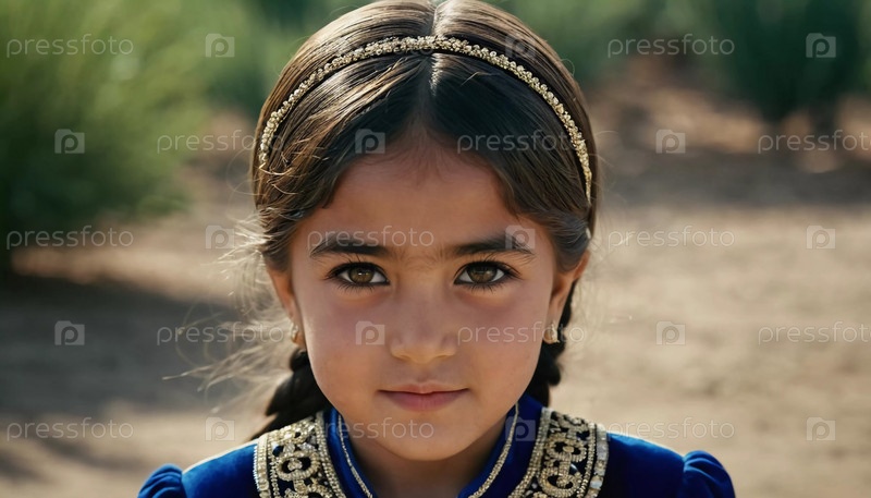 Молодая девушка 5 лет таджикской национальности стоит на улице, одетая в традиционную одежду. Ее выражение лица отражает любопытство и невинность, окруженное спокойствием природы. генерируемый