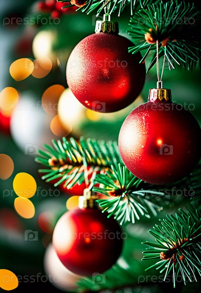 Красочные рождественские украшения украшают ветви елки, яркие шары в оттенках красного и розового, олицетворяющие праздничное настроение зимой. С Новым годом искусство боке фон. Генеративный ИИ