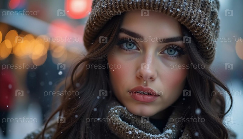 Потрясающая женщина смотрит мягко, когда вокруг нее падают снежинки в восхитительной городской обстановке, захватывая магию рождественского сезона. Красивая брюнетка с длинными волосами. Генерирующий ИИ