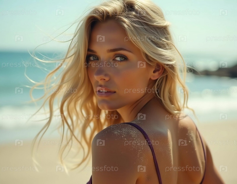 Блондинка в купальнике смотрит назад, стоя у береговой линии. Нежные морские волны лазают у ее ног под ясным голубым небом. Длинные волосы, красивое молодое лицо. Реклама путешествий и одежды. ИИ