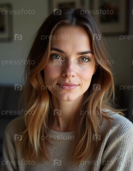 Французская кавказская красивая молодая жительница с волнистыми волосами разделяет подлинную улыбку, стоя в помещении, освещенном естественным светом, создавая притягательную атмосферу. Генерирующий ИИ